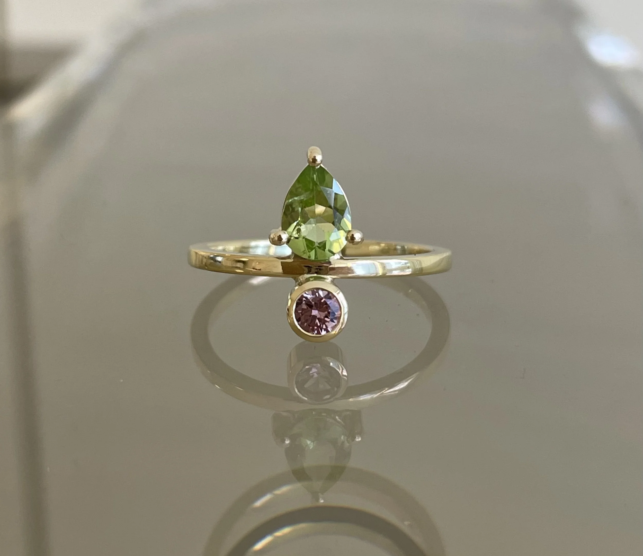 SIDE BY SIDE ring i 18 kt guld med peridot og granat