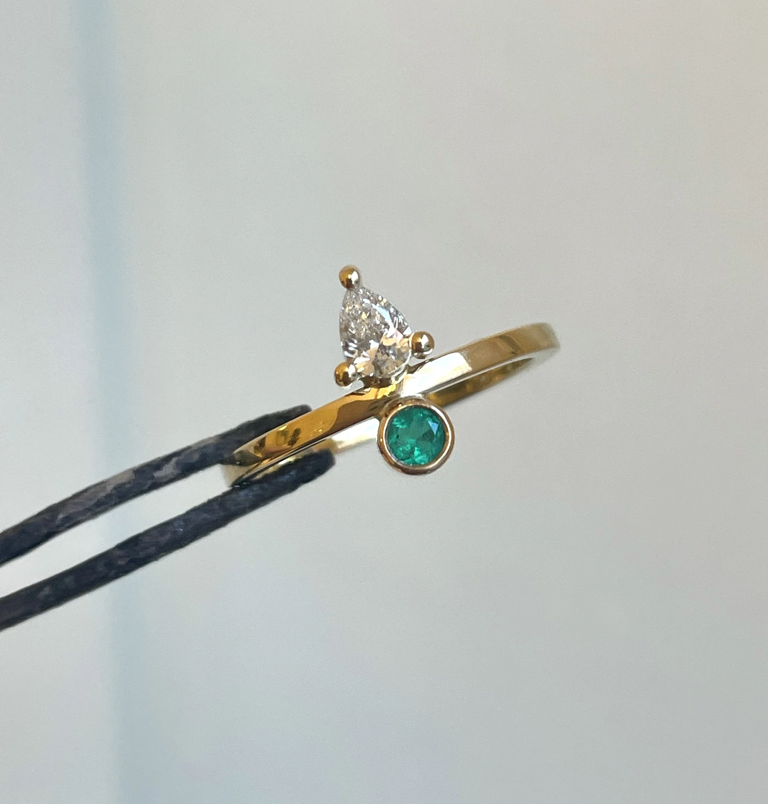 SIDE BY SIDE ring i 18 kt guld med pear shaped diamant og smaragd